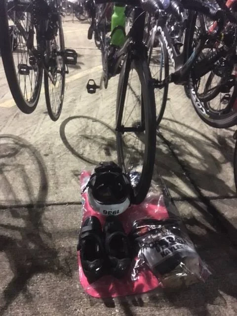 "I’ll go into pretty fine detail as much as I can remember so you can feel like you were there. Speaking of details, of course I started my period on Saturday and this was highly inconvenient. Saturday evening we had a familiar meal of Bison Spaghetti that we had meal prepped and packed to ensure no sickness and to save money on the trip. After, I spoke with you [Coach Cori] on the phone, then tri tatted up and went to bed around 7:15pm. Alarms went off at 4am to eat breakfast and head out early so we could ensure a prime parking spot by the Cobb tent so we could keep our stuff in our car instead of relying on others to watch our stuff. I put a Band-aid brand waterblock bandage on my knee and KT tape on my left hip to help with running pain per Dr. Santo, and then got dressed. I stepped outside on the porch to check the weather conditions. Windy for sure, and still dark from night fall. The sun would show any storms blowing in in a few hours. We got to Transition at 4:40am with a good parking spot. When transition opened, I went ahead and set up my stuff, against Chance’s discretion. I had a stellar idea for my transition to ensure it was wind and waterproof, so I wasn’t worried about it being messed with. If you can tell, I used two of the “Ironman Village Store” bags wrapped around my transition mat in a way so that it was open in the middle, making it easy to pull back and access the contents inside. I taped it together on the underside, and later I came back and taped the whole thing down to the pavement on the top and bottom to prevent wind from blowing it all away. I left the helmet and cycling shoes outside, though there was room inside the bags, because I would be wet when I use those anyway, so rain wasn’t a worry, and it was not extremely windy at this time, so I wasn’t worried about the helmet rolling away. My running shoes I had tied tight in a Walmart bag, socks inside correlating shoes, and a base salts vial tucked in the Yankz laces to put in my pocket (in case I dropped my other on the bike). I then put the visor and running bib over the Walmart bag, but inside the Ironman bag. Toward the top, I have a towel tied tight in a Walmart bag in case of need, and I had an extra gel and water bottle on the other side up top. I also labeled all of my gear (helmet, bike shoes, running shoes, and mat) with a strip of duct tape with my name and phone number in case of wind or carelessness so I could get these higher dollar items back. I’m glad I had my transition so secure, because this was not a worry of mine at all during the race (due to weather or the inexperienced racers next to me- with misracked bikes, run bibs placed on their bikes, and sloppy transition areas). After transition was set up and tire pressure was checked, we dropped our stuff off at the car and went to rest at the Cobb Mobb tent. This was nice because it was a gathering spot that morning where we were able to talk, joke, and help each other. Ashley and Nate arrived while Kat was braiding my hair, Mayhall gave me water, we helped Brandon and Angela put their wet suits on, Rachel was offering food left and right, and Joe was trying to convince Aaron to store his goggles and cap under the thigh silicone seam of his shorts instead of a pocket while Tommy was putting on his wetsuit. Chance made a bathroom get away, and I thought about going too, but I just wasn’t able to work something up. I put my gels for the race into my kit (utilizing all 4 pockets in the jersey and shorts), and at 7am, Joe, Chance, Tommy, and I head towards the water start, and I ate a Cliff banana, beet, and ginger energy food pack. Joe took our shoes and then head back to the Cobb Mobb tent to walk Kat over. Chance went to get in line on the dock while Tommy and I took our time through the crowds. I went through some yoga poses and shoulder openers while Tommy babied his BodyHacker. I then slammed my small bottle of BodyHacker, and we head to the dock to get in line.
